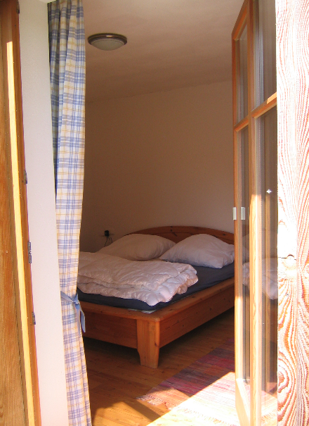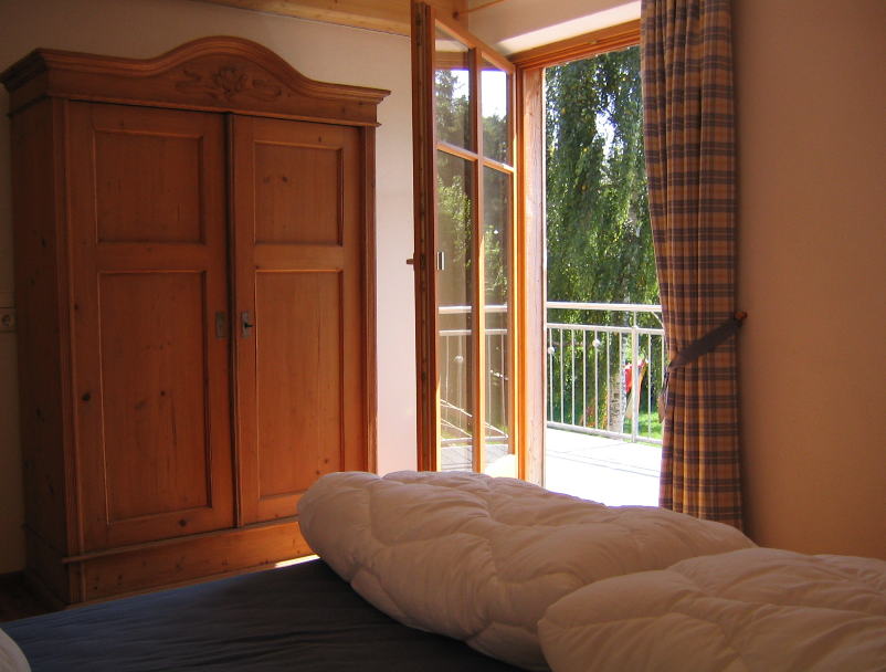 Sie besteht aus Wohnraum mit integrierter Küche und einer Schlafcouch,einem großzügigen Bad,einem Doppelzimme,einem Doppelzimmer mit getrennten Betten sowie einem Einzelzimmer. Die Wände wurden lehmverputzt und im Innenbereich wurden naturbelassene Holzböden gelegt. Die Ausstattung ist hochwertig und vermittelt große Behaglichkeit. Die Wohnung verfügt über einen großen Balkon – eine Treppe führt davon direkt zum Garten.